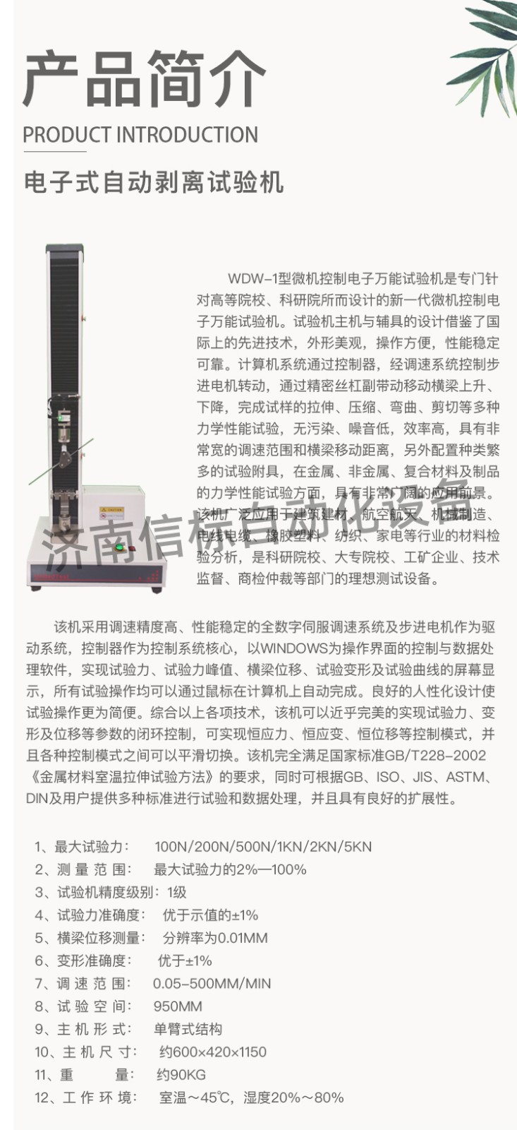 高強度膠黏劑膠帶浮棍法90度180度剝離強度試驗機主要功能及特點: 1、主機: 1.1調速系統采用伺服電機和自主研發減速系統,性能穩定可靠,具有過流、過壓、過載等保護裝置。調速范圍可達0.05~500mm/min。 1.2傳動部分采用圓弧同步齒形帶,精密絲杠副傳動,傳動平穩,噪音低,傳動效率高。 1.3萬向節采用十字插銷結構,而且具有擺角限制功能,一方面便于試樣夾持,保證試驗同心度,另一方面很好的消除了不規則試樣對傳感器的影響。 2、控制系統、操作軟件及數據處理系統 2.1計算機控制系統,具有集成度高、性能穩定、調整方便等優點。可以對實驗數據進行實時采集,對實驗特性曲線實現實時動態顯示,試驗數據文件能以Access常用數據庫或SQLserve大型數據庫的方式保存,方便實現客戶的資源共享及網絡管理,以及用戶的再分析。對于用戶自定義的各種word2000報表,該軟件可輕松實現訪問,解決了不同用戶或同一用戶在不同時期對試驗報表有不同需要的難題。該軟件可處理試驗力、位移、時間、變形的原始數據及由此派生的曲線。