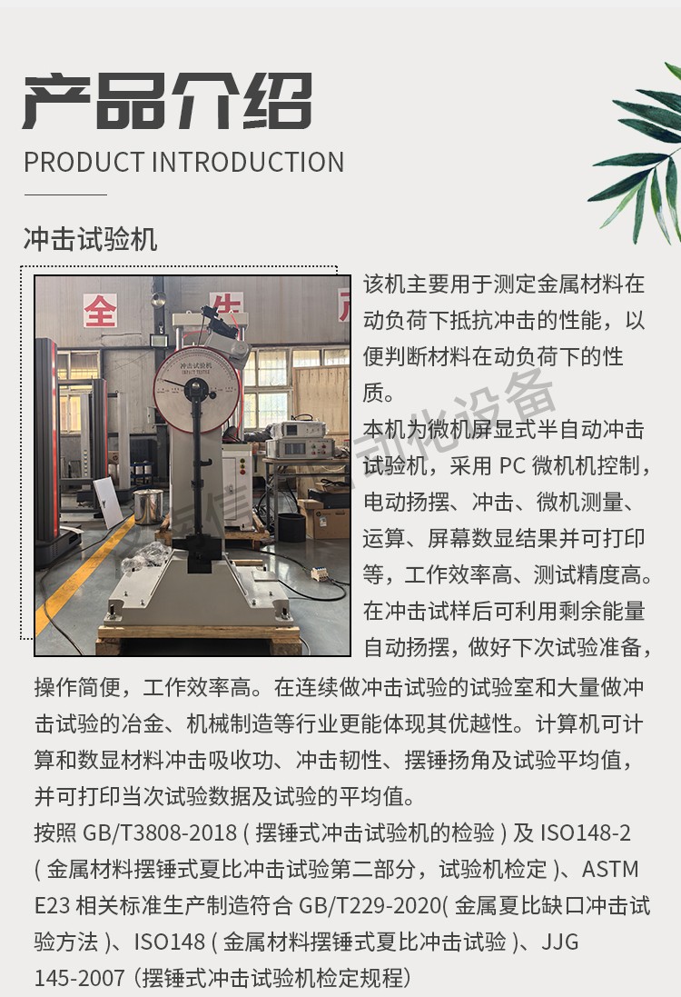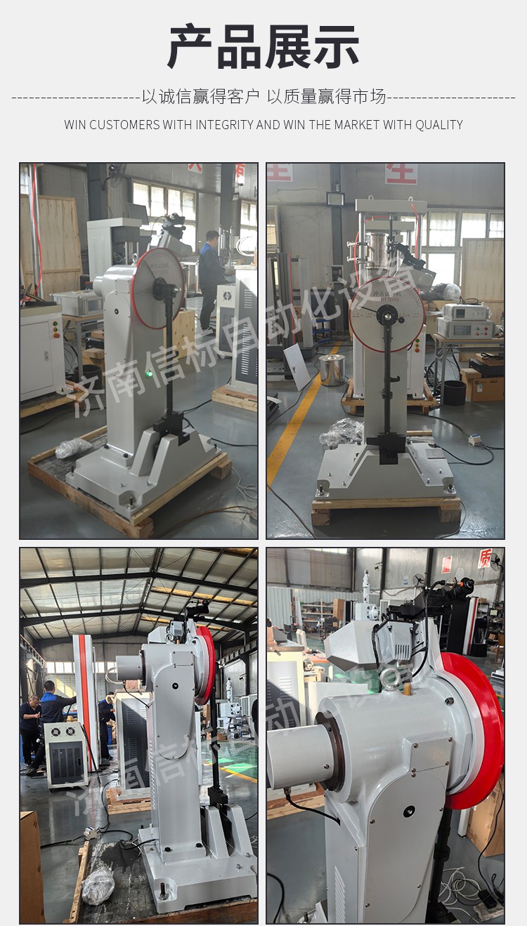 本機為微機屏顯式半自動沖擊試驗機,采用PC微機機控制,電動揚擺、沖擊、微機測量、運算、屏幕數(shù)顯結(jié)果并可打印等,工作效率高、測試精度高。在沖擊試樣后可利用剩余能量自動揚擺,做好下次試驗準備,操作簡便,工作效率高。在連續(xù)做沖擊試驗的試驗室和大量做沖擊試驗的冶金、機械制造等行業(yè)更能體現(xiàn)其優(yōu)越性。計算機可計算和數(shù)顯材料沖擊吸收功、沖擊韌性、擺錘揚角及試驗平均值,并可打印當次試驗數(shù)據(jù)及試驗的平均值。 按照 GB/T3808-2018 (擺錘式?jīng)_擊試驗機的檢驗)及 ISO148-2(金屬材料擺錘式夏比沖擊試驗第二部分,試驗機檢定)、ASTM E23 相關(guān)標準生產(chǎn)制造符合 GB/T229-2020(金屬夏比缺口沖擊試驗方法)、ISO148 (金屬材料擺錘式夏比沖擊試驗)、JJG 145-2007 (擺錘式?jīng)_擊試驗機檢定規(guī)程) 四、主要技術(shù)指標: 1、沖擊能量:150J、300J 2、擺錘預(yù)揚角:150° 3、擺軸中心至沖擊點距離:750mm 4、沖擊速度:5.2m/s 5、試樣支座跨距:40mm 6、鉗口圓角:R1-1.5mm 7、沖擊刀刃圓角:R2-2.5mm 8、沖擊刀厚度:16mm 9、角度準確度:±0.1° 10、試樣尺寸:10×10×55mm 11、外形尺寸:2124 mm×600 mm×1340 mm 12、試驗機凈重:450Kg 13、電源:交流三相 380V±10% 50HZ 5A 14、環(huán)境條件:周圍環(huán)境中無腐蝕介質(zhì),無震動,無強電磁場干擾。 五、設(shè)備主要配置: 1、300焦耳主機一臺; 2、150J、300J 擺錘各一個 3、取擺傳動裝置一套(裝在主機上) 4、自動掛擺裝置一套(裝在主機上) 5、保險機構(gòu)一套(裝在主機上) 6、安全防護裝置一套 7、擺錘拆卸器一只 8、支座調(diào)校器一只 9、試樣對中器一只 10、聯(lián)想打印機一套 專用測量軟件一套