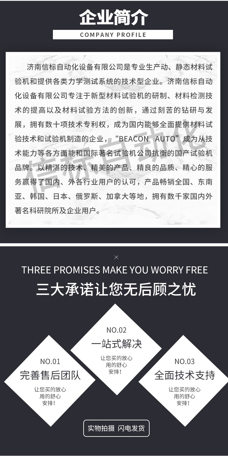 濟南信標自動化設備有限公司主要生產:動靜態萬能疲勞試驗機,接骨板彎曲試驗機,縫合線拉伸疲勞試驗機,髖膝關節磨損試驗機,電子萬能試驗機、液壓萬能試驗機、巖石三軸、四軸,電液拉力試驗機,材料試驗機,高低溫蠕變,高低頻疲勞,拉伸、扭轉、杯突等二十多個系列兩千多個的品種。