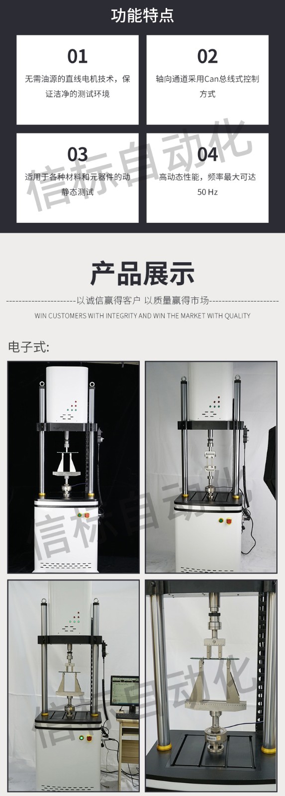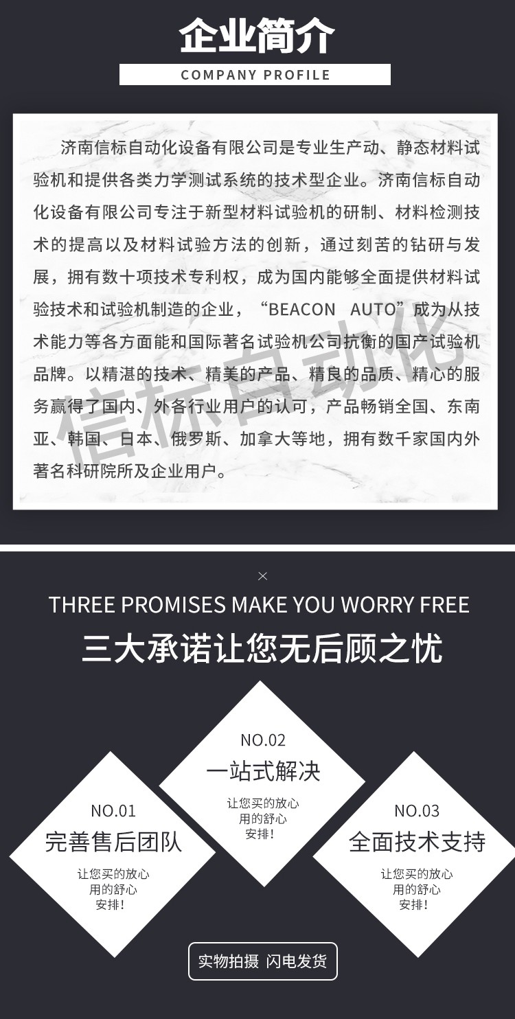 濟南信標自動化設備有限公司主要生產:動靜態萬能疲勞試驗機,接骨板彎曲試驗機,縫合線拉伸疲勞試驗機,髖膝關節磨損試驗機,電子萬能試驗機、液壓萬能試驗機、巖石三軸、四軸,電液拉力試驗機,材料試驗機,高低溫蠕變,高低頻疲勞,拉伸、扭轉、杯突等二十多個系列兩千多個的品種。