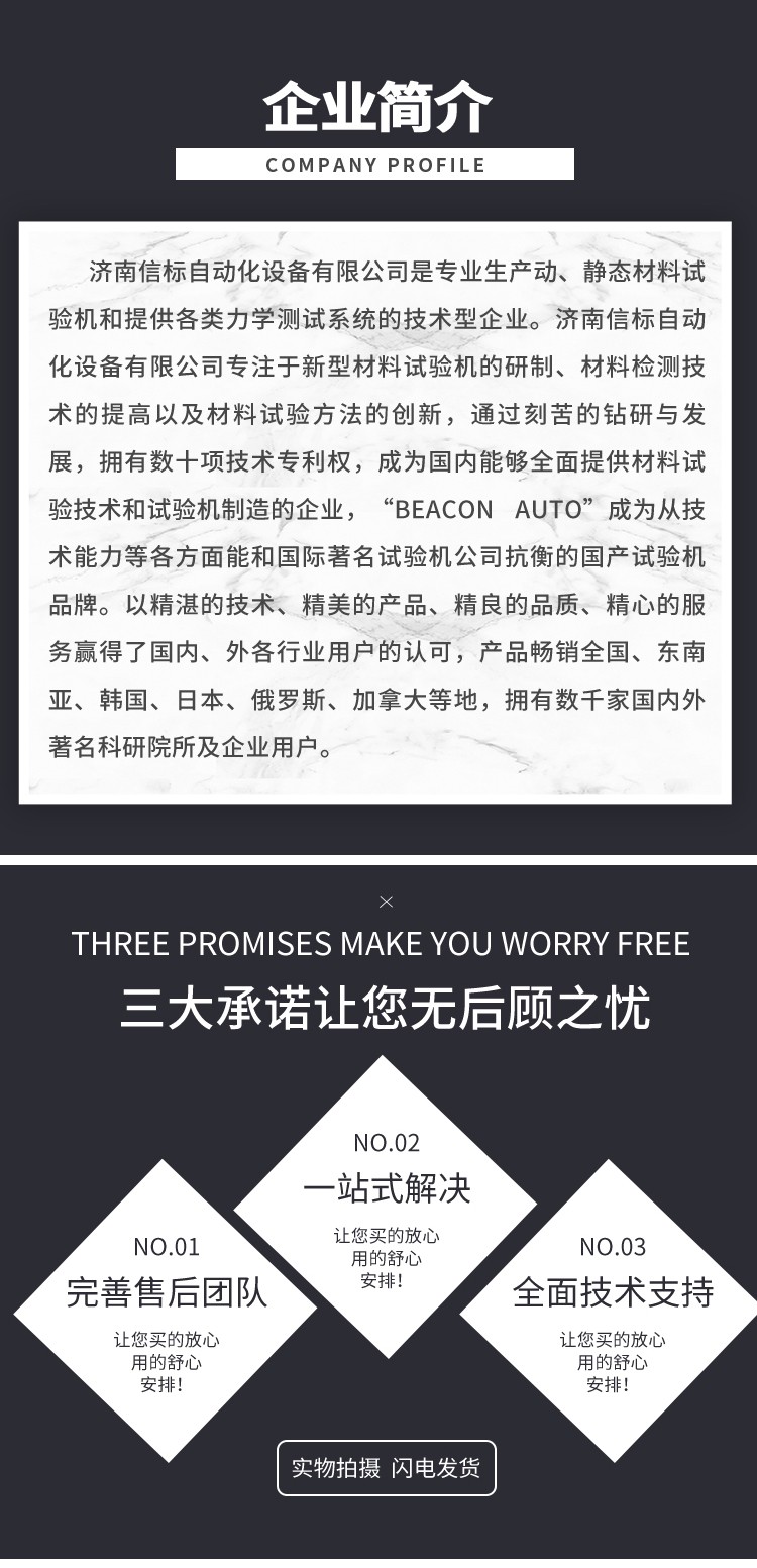 濟南信標自動化設備有限公司主要生產:動靜態萬能疲勞試驗機,接骨板彎曲試驗機,縫合線拉伸疲勞試驗機,髖膝關節磨損試驗機,電子萬能試驗機、液壓萬能試驗機、巖石三軸、四軸,電液拉力試驗機,材料試驗機,高低溫蠕變,高低頻疲勞,拉伸、扭轉、杯突等二十多個系列兩千多個的品種。