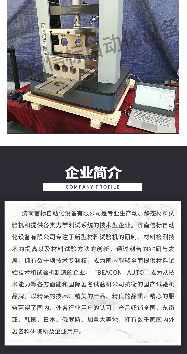 濟南信標自動化設備有限公司主要生產:動靜態萬能疲勞試驗機,接骨板彎曲試驗機,縫合線拉伸疲勞試驗機,髖膝關節磨損試驗機,電子萬能試驗機、液壓萬能試驗機、巖石三軸、四軸,電液拉力試驗機,材料試驗機,高低溫蠕變,高低頻疲勞,拉伸、扭轉、杯突等二十多個系列兩千多個的品種。