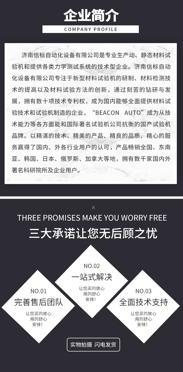濟南信標自動化設備有限公司主要生產:動靜態萬能疲勞試驗機,接骨板彎曲試驗機,縫合線拉伸疲勞試驗機,髖膝關節磨損試驗機,電子萬能試驗機、液壓萬能試驗機、巖石三軸、四軸,電液拉力試驗機,材料試驗機,高低溫蠕變,高低頻疲勞,拉伸、扭轉、杯突等二十多個系列兩千多個的品種。