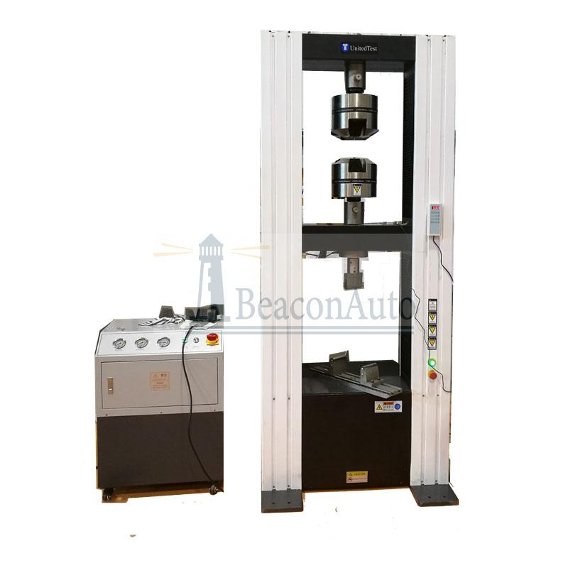 5噸安全帶破斷拉力(負荷)試驗機 安全帶破斷拉力(負荷)試驗機產品介紹: 安全帶破斷拉力(負荷)試驗機主要用于測試道路車輛安全帶的破斷力、破斷負荷、拉力、抗拉強度、拉伸破壞、拉伸負荷、斷裂強度、斷裂延伸力、延伸率、伸長率等力學性能檢測。 安全帶破斷拉力(負荷)試驗機安全帶破斷力試驗機測試方法: 1、首先按下復位鍵使安全帶破斷力試驗機上夾頭復位,當達到復位狀態后電極停止運轉,按夾樣鍵安全帶破斷力試驗機的上夾頭開始向上運行移動夾持長度當上夾頭達到設定的夾持長度時電機停止運轉,夾持試樣,把事先處理好的安全帶放在上下兩夾頭之間然后使用鎖緊裝置固定好。 2、按下拉伸鍵安全帶破斷力試驗機上夾頭向上運行開始拉伸試樣此時力值和伸長瞬間清零由零開始逐漸上升,安全帶電子試驗機動態的變化量顯示在相應的屏幕中當力值達到該試樣的拉伸斷列大值時試樣被拉斷電機停止運轉,大力值和伸長量鎖定在力值和伸長顯示屏上。 3、電機判停后,系統等待10秒鐘后自動復位,試驗次數會自動減一顯示在次數顯示屏上,在此時間內如果用戶對本次試驗數據不滿意可以按刪除鍵來刪除本次試驗,則該次試驗取消,不影響總的試驗次數。 4、當下夾頭復位后,-次試驗做完,再按夾樣鍵開始移動夾持長度即重復2-3步驟直到做完設定次數此時次數顯示為零,按下打印鍵試驗數據開始打印。 5、在沒按復位鍵之前試驗數據可以再次打印,打印完后如需繼續做試驗按下復位鍵系統恢復到上電狀態,按夾樣鍵進行下一組試驗。 安全帶破斷拉力(負荷)試驗機技術參數: 試驗機精度:1級 試驗力測量范圍:0. 4%-100%FS 試驗力準確度:優于士1% 位移分辨率:0. 001mm 位移測量準確度:優于土1% 試驗速度范圍:0. 001-500mm/min 拉伸空間(不含夾具): 600mm 立柱間距:400mm 電機功率:0. 75KW 供電電源:220V, 50Hz 工作環境:室溫- 35℃相對濕度不超過80% 更多安全帶破斷拉力(負荷)試驗機資料請電話聯系我們。