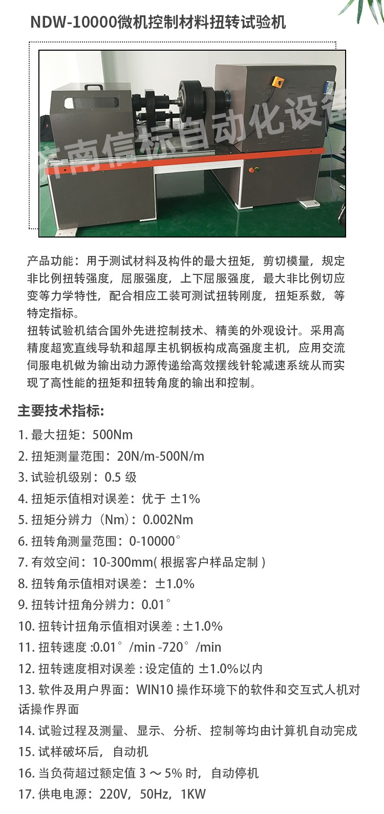 滿足及參考標(biāo)準(zhǔn): 1. GB/T2611-2007《試驗(yàn)機(jī)通用技術(shù)要求》 2. GB/T10128-1998/2007 《金屬室溫扭轉(zhuǎn)試驗(yàn)方法》 3. ISO7800-2003金屬材料單軸扭轉(zhuǎn)試驗(yàn)方法 4. ASTM A 938-2004金屬線扭轉(zhuǎn)試驗(yàn)方法 5. ASTM A938-07 鋼絲扭轉(zhuǎn)試驗(yàn)的試驗(yàn)方法 用于測(cè)試材料及構(gòu)件的最大扭矩,剪切模量,規(guī)定非比例扭轉(zhuǎn)強(qiáng)度,屈服強(qiáng)度,上下屈服強(qiáng)度,最大非比例切應(yīng)變等力學(xué)特性,配合相應(yīng)工裝可測(cè)試扭轉(zhuǎn)剛度,扭矩系數(shù),等特定指標(biāo)。 構(gòu)成高強(qiáng)度主機(jī),應(yīng)用交流伺服電機(jī)做為輸出動(dòng)力源傳遞給高效擺線針輪減速系統(tǒng)從而實(shí)現(xiàn)了高性能的扭矩和扭轉(zhuǎn)角度的輸出和控制。 控制系統(tǒng)采用世界流行的高速PCIE標(biāo)準(zhǔn)并行總線設(shè)計(jì),采用美國BB公司放大器,AD公司的高速模數(shù)轉(zhuǎn)換器及CPLD構(gòu)成數(shù)據(jù)采集系統(tǒng)及高精度扭矩傳感器構(gòu)成測(cè)量控制系統(tǒng)。控制器可擴(kuò)展支持,LAN USB CAN等通訊方式。 試驗(yàn)機(jī)專業(yè)軟件可實(shí)現(xiàn)自動(dòng)求取最大扭矩、抗扭強(qiáng)度、上下屈服扭矩、規(guī)定非比例扭矩、切變模量等數(shù)據(jù)和指標(biāo),計(jì)算機(jī)控制系統(tǒng)對(duì)試驗(yàn)過程的控制和數(shù)據(jù)處理符合相應(yīng)國際標(biāo)準(zhǔn)的要求,多種數(shù)據(jù)輸出方式,標(biāo)準(zhǔn)報(bào)表,Excel,word,開放式數(shù)據(jù)庫MDB及原始數(shù)據(jù)源txt形式本機(jī)無污染、噪音低,效率高,具有較寬的調(diào)速范圍。本機(jī)適用于各種金屬、非金屬及復(fù)合材料的力學(xué)性能指標(biāo)的測(cè)試,完全符合國家相關(guān)標(biāo)準(zhǔn)的要求。 結(jié)構(gòu)組成 加載單元:采用行星減速機(jī)作為減速單元配置伺服電機(jī)加載,減速機(jī)定制采用零背隙結(jié)構(gòu),此結(jié)構(gòu)可保證在扭轉(zhuǎn)過程中,無系統(tǒng)間隙,除滿足常規(guī)靜態(tài)測(cè)試外還可進(jìn)行低周疲勞,過零時(shí)(扭矩從正向最大減小到零在反向加載到最大的中間過程為過零,)可保證曲線的完整性和數(shù)據(jù)的準(zhǔn)確。